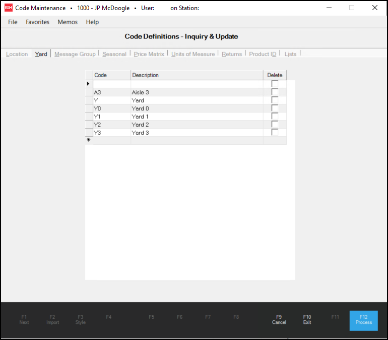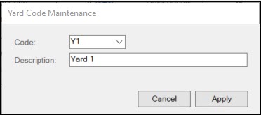 Yard codes are similar to location codes in that they indicate where a product is located, but limited to 2-characters and are printed on "yard" style documents. Certain Style (F3) options for the grid will display yard codes. There is also a Yard copy invoice style that only prints when yard items are present and will not be printed if no yard items are found in the transaction. This form can be used to add, modify, and delete* codes but cannot be used for associating those codes with inventory items.