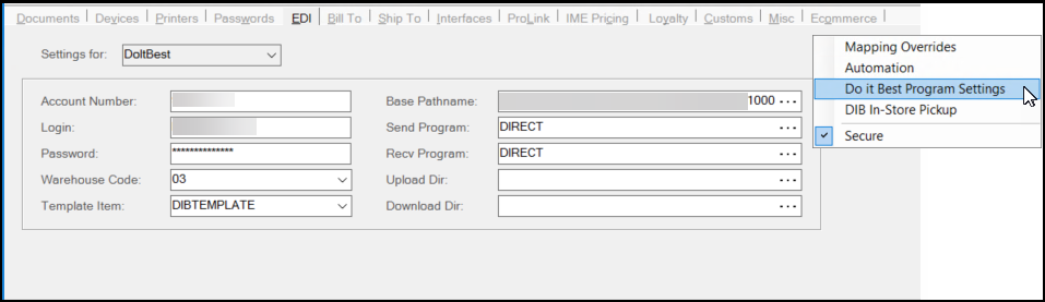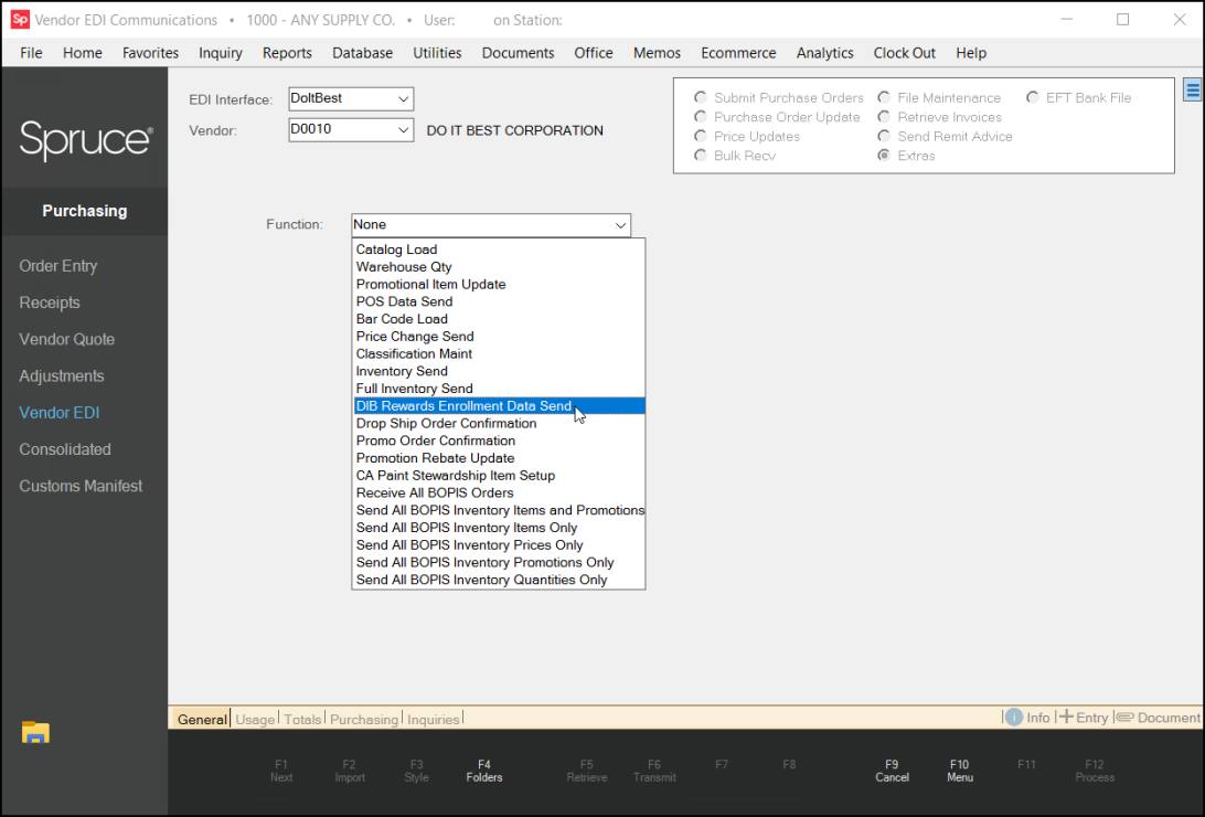 If the EDI parameters, Run Nightly EDI and POS Data Send are enabled (checked) for your company, a daily automated process will transmit the enrollment data to a Do it Best FTP server where they will retrieve it. If for some reason, the nightly process fails to run (due to Internet interruption or other issues, for example), you can manually send the enrollment data from the Extras menu option in the Vendor EDI form (Purchasing > Vendor EDI > Extras > Function: DIB Reports Enrollment Data Send).