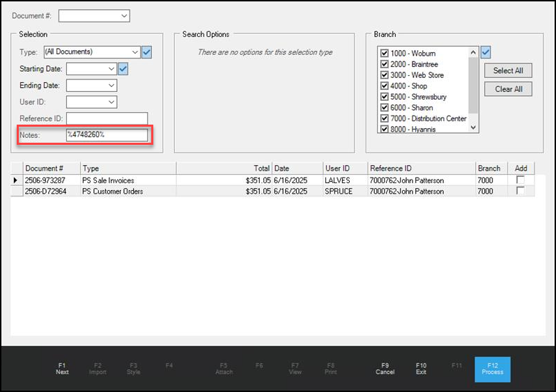 Note: If you are looking for a Spruce eCommerce order (with a SPEC-specific ID), we keep track of this information in the Order and Sale documents linked to the transaction. You can use the Document Viewer to search for the ID by entering the seven-digit ID in the Notes field between two % symbols.