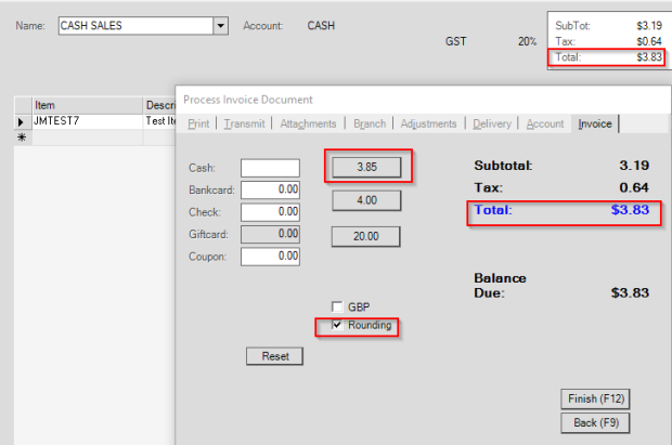 Note: If you uncheck the Rounding check box, the remittance amount would be 3.83 in the button beside the Cash field.