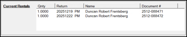 This panel is visible when reserving or renting only, not when returning an item. Documents linked with current rentals for the selected item will be listed. This listing will not include reserved but not yet invoiced rentals. Only rentals that are actually out for the current time/date will be included (if any). This panel is not dependent on or affected by calendar selections.