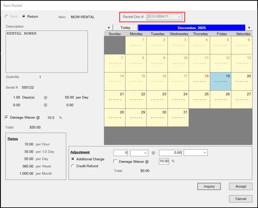5. From the Rental Doc list, choose the rental document for the item the customer is returning. The Adjustment fields enable.