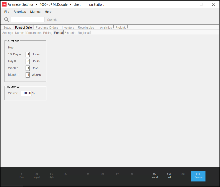 You can set some Rental parameters, including Rental Durations (in hours, weeks, months) and Insurance Waiver percentages in the Parameter Settings form. Setting these options requires system administrator privileges.