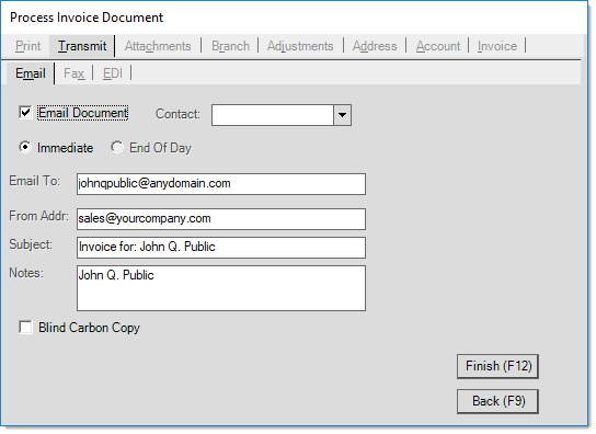 Note: Manual changes to the email addresses, subject, and notes are allowed; however, later changes on the Process form can either reset the subject and notes back to defaults or append to the existing subject or notes. For this reason, make changes to the subject and notes last (just before final processing by clicking the Finish (F12) button). |