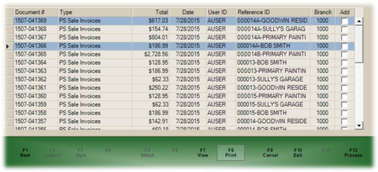 The Document form can be used to print, view, list, and locate any type of document maintained by the software. It's important to understand that not all types of documents can be faxed (or emailed). As a general rule, if the document can be faxed from another area (a Process form, for example), it can be faxed from documents also; however, if not, it probably can't. Faxing is accomplished by selecting the documents* you want to fax as rows in the grid and using the Print (F8) function which opens up a processing form.