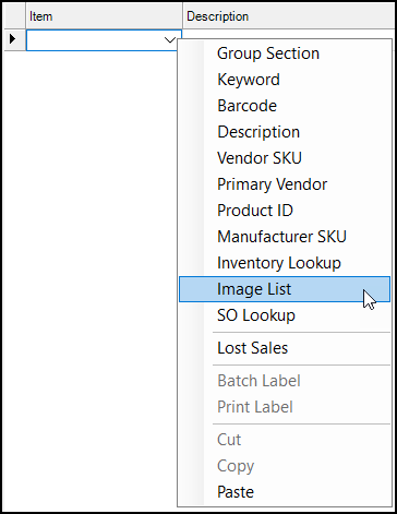 After you have created an Image List and added items to it, you can access the image list from any Item list in a data grid: right-click the down arrow of any Item list, and select the Image List option.