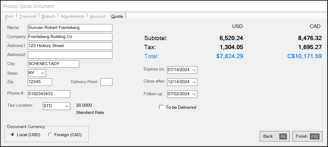 Choosing the To be Delivered check box can change the sales tax for the quote in some areas. If the quote includes a delivery to another tax location, the tax location can change when the delivery location is different from your branch's tax location (or if the account and/or transaction isn't currently considered exempt).