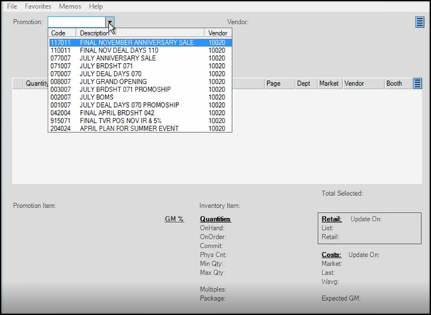 3. Click the Ordering (F5) key and choose the Vendor Promotion option from the context list. The Vendor Promotion Selection list displays.