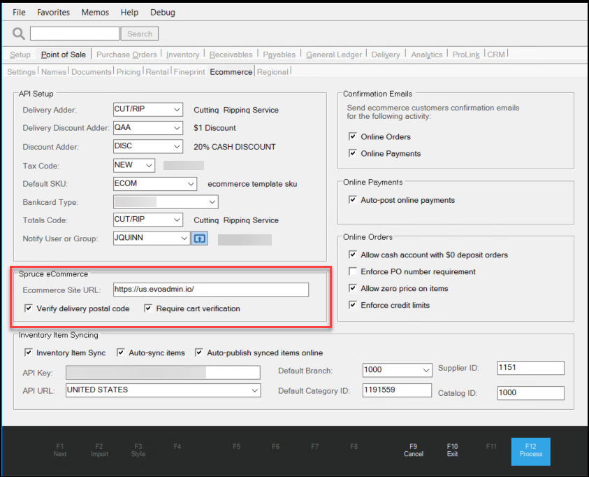 Important Note: Your EvolutionX API key must be active to display the Spruce eCommerce box shown in this figure. If these fields do not display, check with your ECI Implementation or Support Specialist to enable this setting.