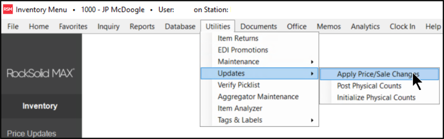 You can access this utility from the Main Menu by selecting Inventory > Utilities > Updates > Apply Price /Sales Changes.