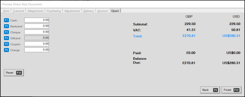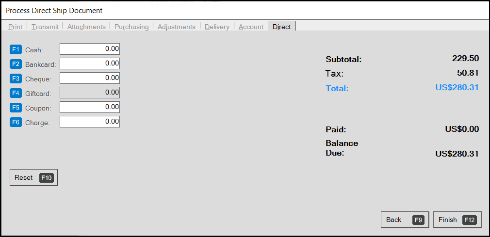 This is the Direct Ship Process (F12) form, which is a bit more complex than the one's for other Point of Sale activities, because you are actually processing two different documents at the same time: