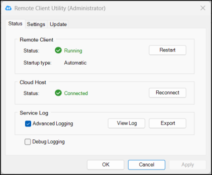 3. Click the Update tab and click Check for Update to ensure you have the latest version of the Remote Client. When this process is complete, continue to the next step.