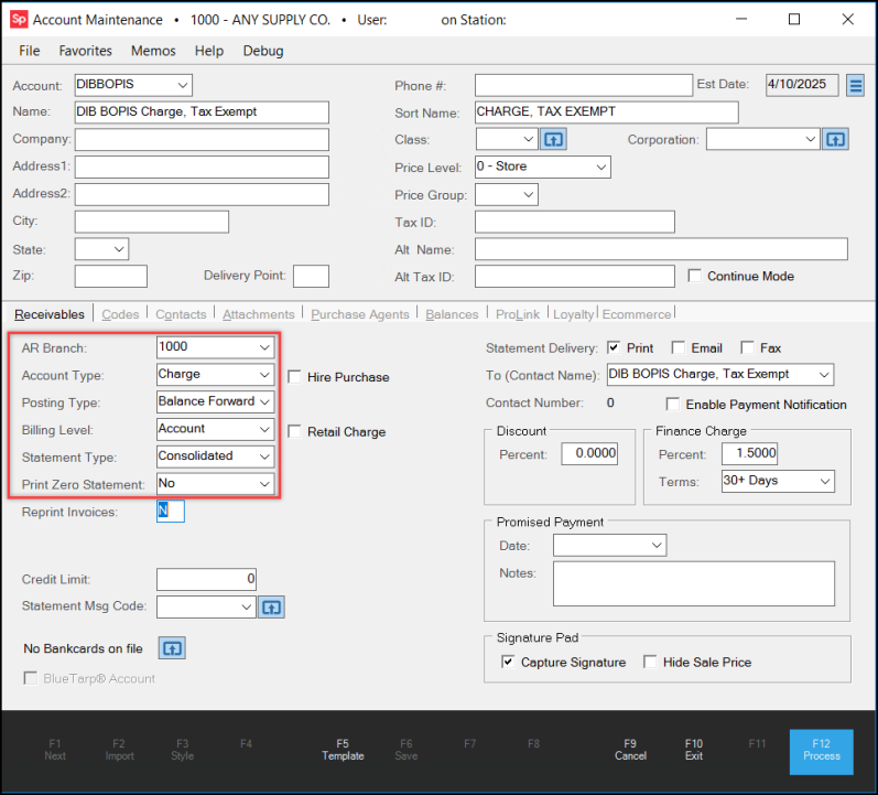 When you set up the DIB BOPIS branch, you add a standard receivables account that the application can use to collect the DIB BOPIS records that are submitted for your store. Use the instructions below to establish this account. The charge account must be tax-exempt and must disable sales prices as we describe below. You can use this account record to bring up any BOPIS orders that show up for your store. It is not necessary to set a credit limit for the account. If you accept DIB BOPIS orders at more than one store, you should set up DIB BOPIS accounts at each branch location for tracking and accounting purposes.