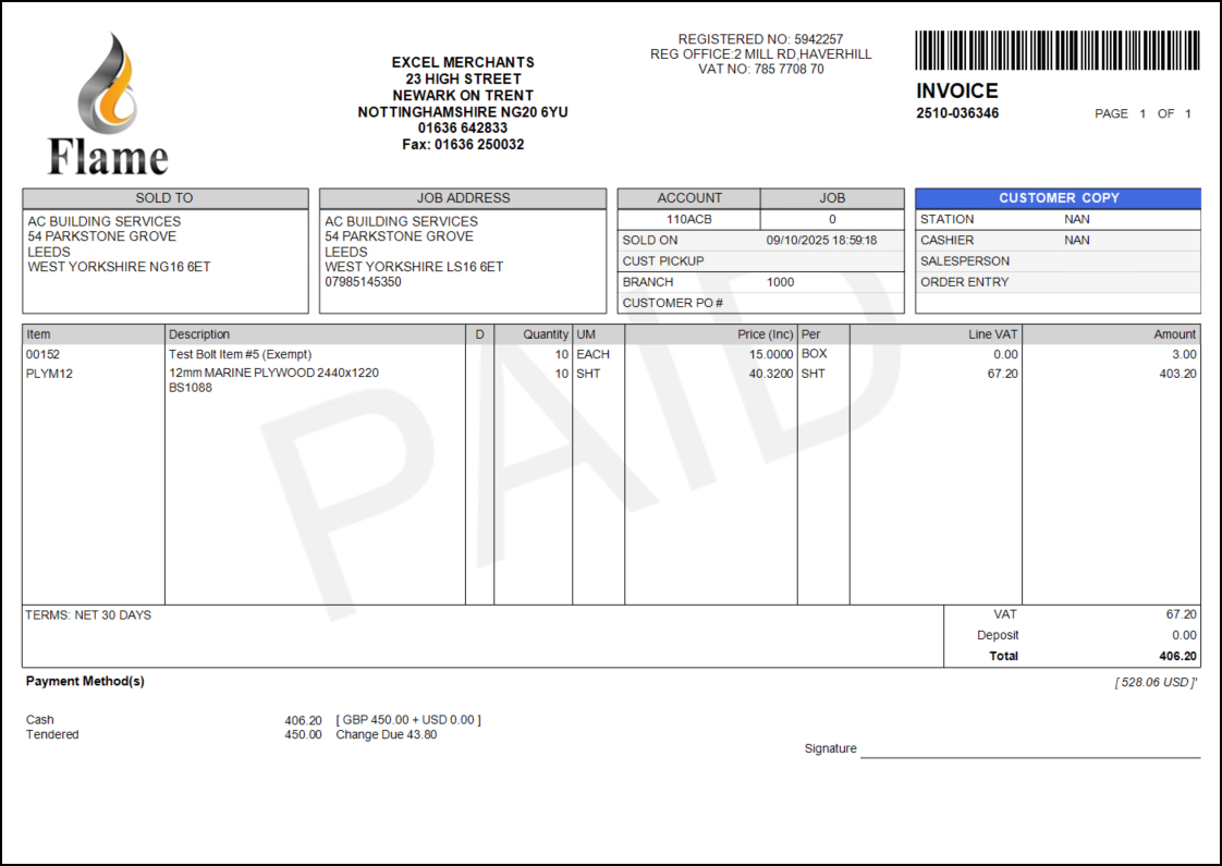 For invoices that are generated in the United Kingdom and in regions that use the VAT tax processes, typically the VAT amount is part of the individual item cost and is not specifically documented. The Invoice Tax format gives you a way of providing this information to the customer if they request it. This invoice document format is only available to businesses with VAT regional settings.