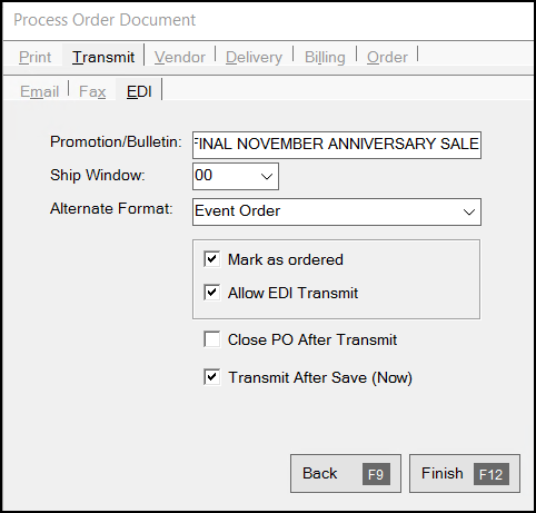 14. Choose Process (F12) to transmit the order to True Value using the EDI process.